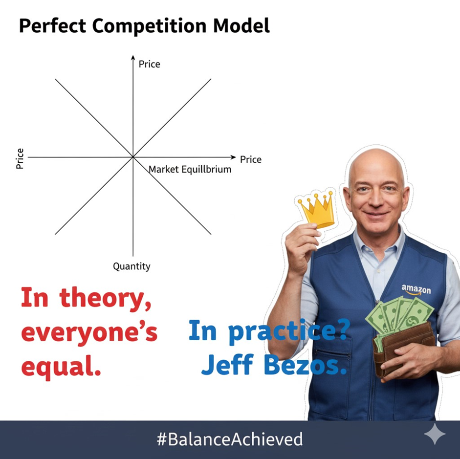 theory, perfect competition works, but in real life, markets are driven by greed, branding, and