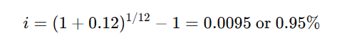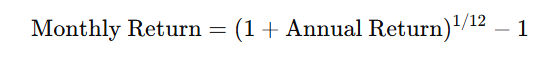 A common mistake is dividing the annual rate by 12 (12% ÷ 12 = 1%), which is inaccurate because returns are compounded. Instead, convert annual returns into monthly returns using: