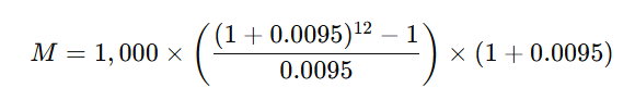 You invest ₹1,000 per month for 12 months at an annual return rate of 12%.
