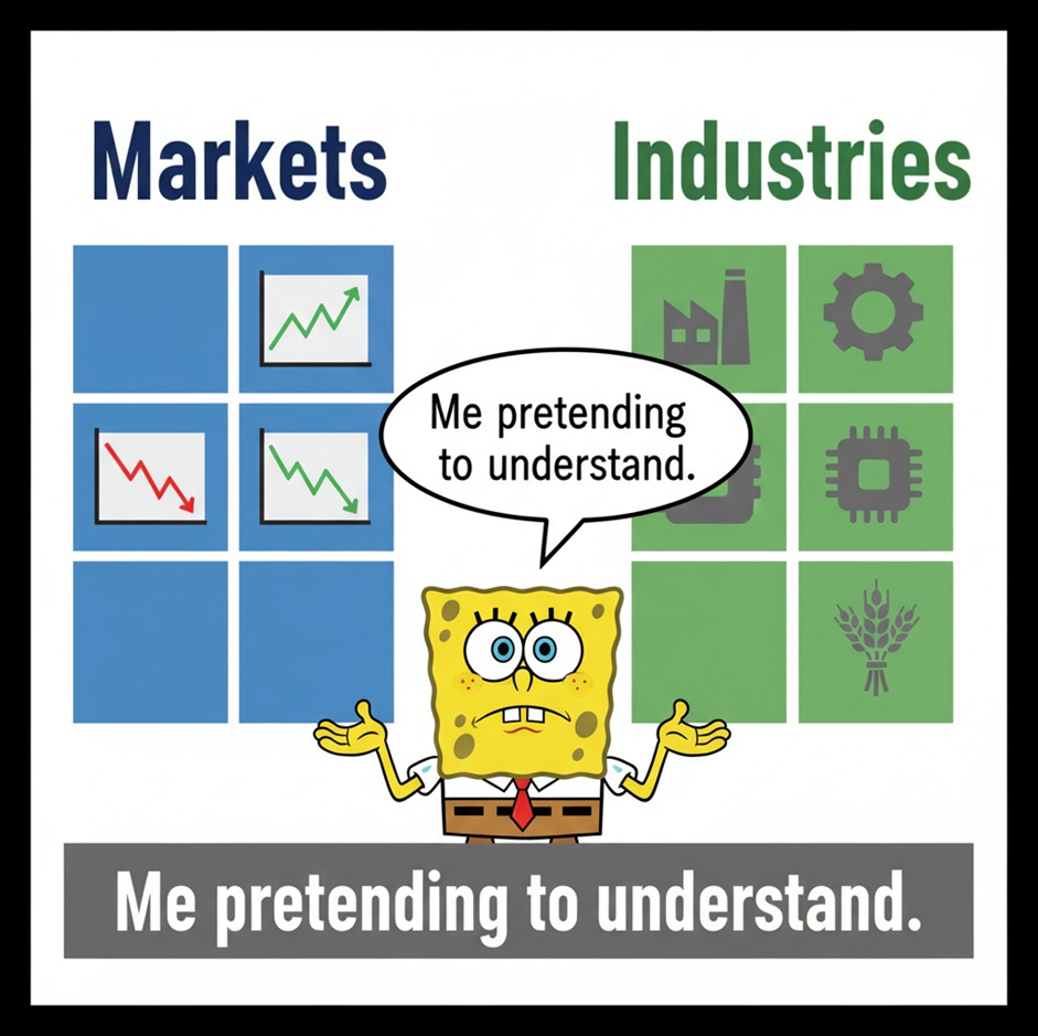 Step 4: Who really wins, markets or industries? (It’s a trick question; it’s neither) Markets may seem glamorous, but they wouldn’t be there without industry performing the hard work. Industries may drive the economy, but they cannot draw the necessary capital to operate without markets. So who comes out on top? Capitalism. Always capitalism. Investors get their money from markets. The machine gets its power from industries. What about you? You eat “hope,” caffeine, and memes about how you can’t afford health care. Markets make the news. Industries have problems with workers. “Growth” is a word that markets use. Companies discuss about “restructuring.” The only people who win are those who are already rich enough not to care which one falls next. Experts think “the fundamentals are strong,” but everyone else just has to watch their paychecks dwindle. Where is it strong, Greg? Show me one basic thing that has paid my rent.